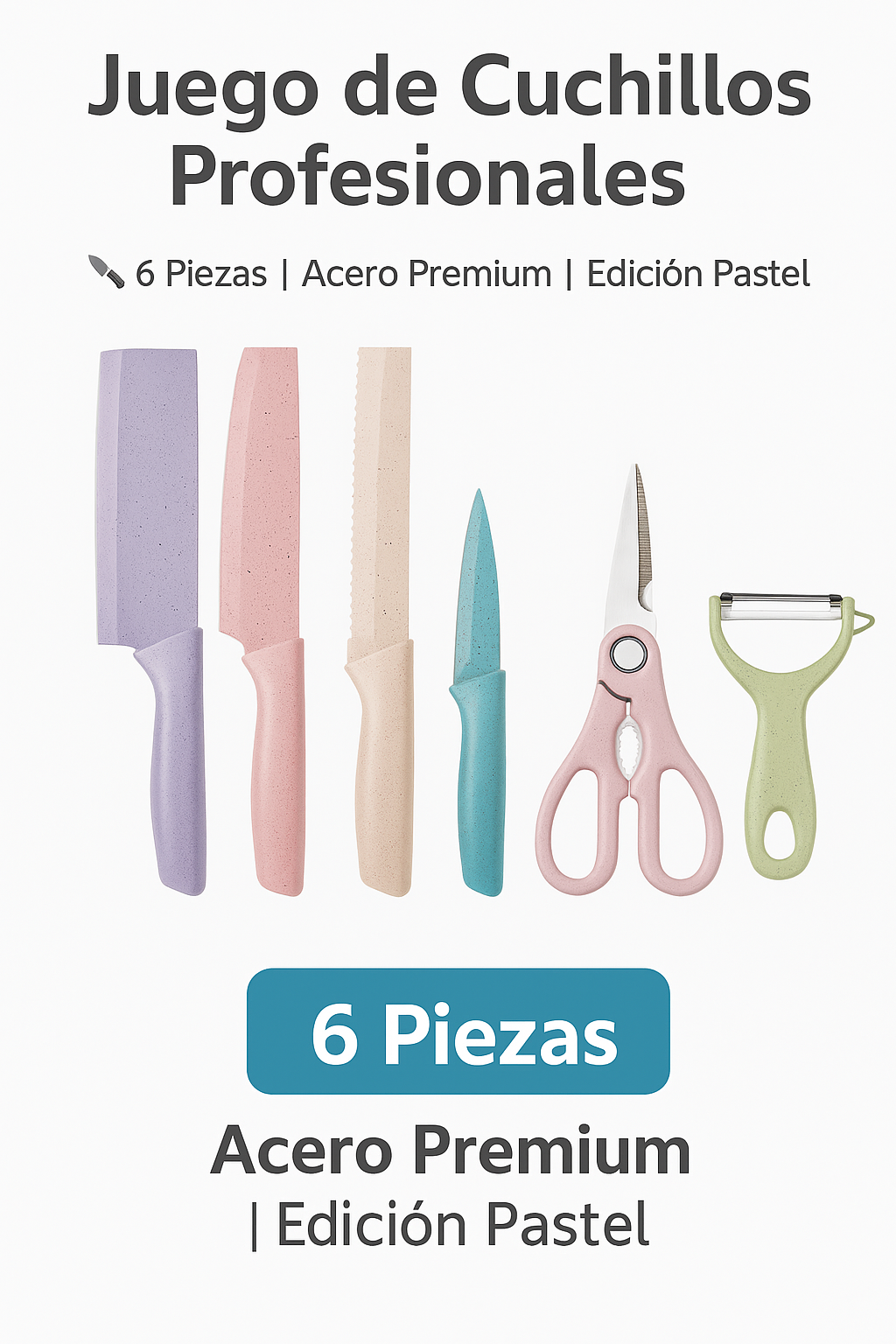 ✅ 6 cuchillos esenciales: chef, pan, pelador, carnicero, Santoku y utilitario – para cada tipo de corte.